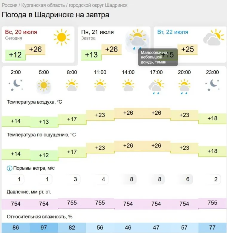 «Утром в Шадринске ожидается около 13 градусов. Днем воздух прогреется до 26. Вероятен туман и небольшой дождь», — указано в прогнозе Gismeteo.