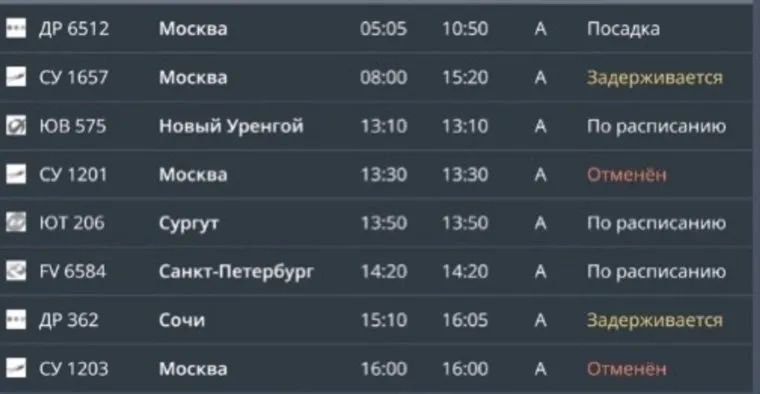 «Отменены следующие рейсы в Москву: СУ1395 с планируемым вылетом в 06:25, СУ1201 — в 13:30 и СУ1203 — в 16:00. Рейс СУ1657 в аэропорт „Шереметьево“, который должен был вылететь в 08:00, задержан почти на шесть часов и вылетит только в 13:40. В то же время рейсы СУ1769, СУ1207 и СУ1205 будут выполняться согласно расписанию», — сказано на онлайн-табло пермского аэропорта Большое Савино.