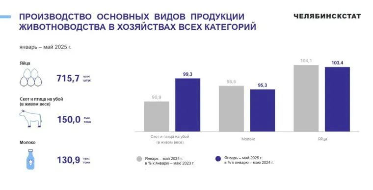 «Производство основных видов продукции животноводства в хозяйствах всех категорий. Молоко в январе-мае 2025 к аналогичному периоду 2024 года: 95,3», — отмечено в отчете Челябинскстата.