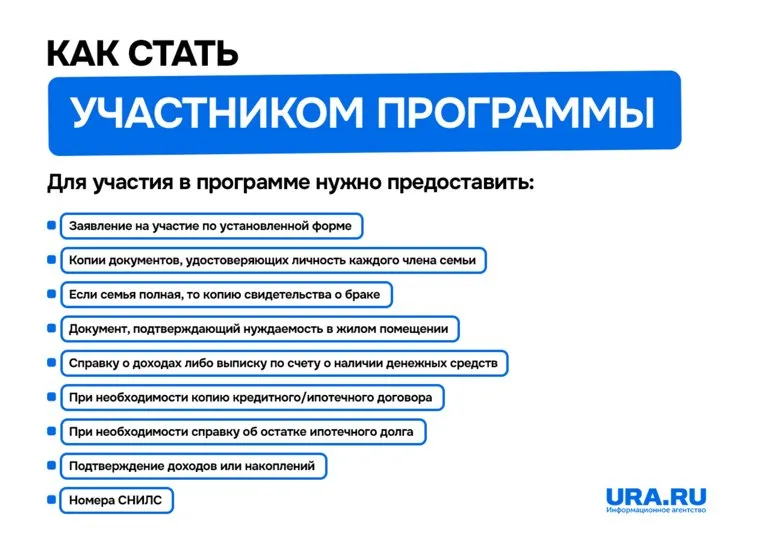 Для участия в программе молодым семьям необходимо подать заявление и комплект требуемых документов в орган местного самоуправления по месту проживания. Как пояснила руководитель практики частного права Amulex.ru, юрист Елена Проскурова, к заявлению установленного образца необходимо приложить копии паспортов всех членов семьи, свидетельство о браке (если семья полная), документ, подтверждающий необходимость улучшения жилищных условий, справку о доходах или выписку по счету, подтверждающую наличие средств, при необходимости — копию кредитного или ипотечного договора, а также справку об остатке долга по ипотеке и номера СНИЛС.