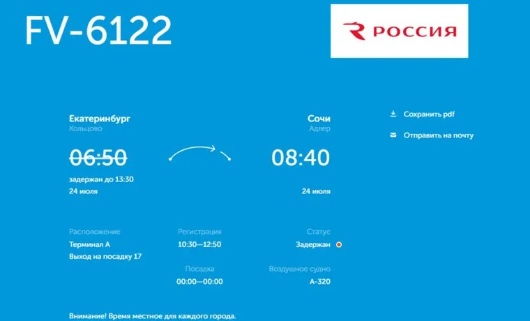 Самолет авиакомпании «Россия» должен был вылететь в 06:50 и приземлиться в Сочи в 08:40 по местному времени. Однако рейс перенесли на 13:30.