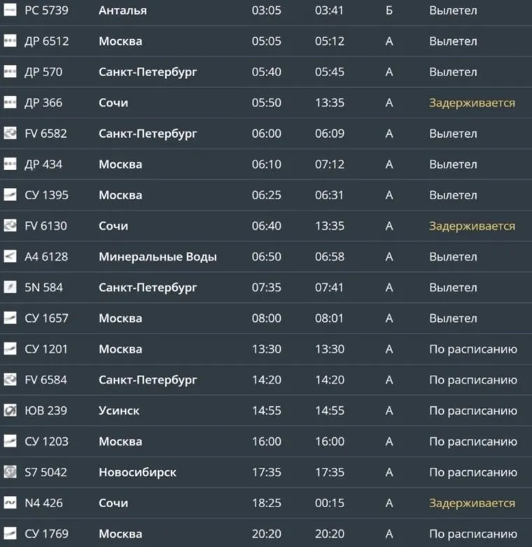 Причина задержек — ограничение работы аэропорта Сочи из-за угрозы атаки беспилотников