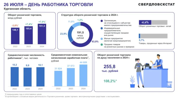 В Курганской области и по всей России 26 июля празднуется День работника торговли. В регионе в 2024 году наблюдается рост оборота розничной торговли. Об этом URA.RU сообщили в пресс-службе Свердловскстата.