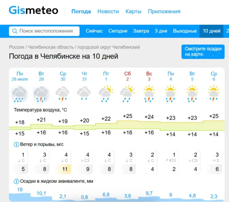 «В Челябинске 28 июля выпадет 18 миллиметров осадков. 29 июля — не менее десяти миллиметров», — говорится в данных на сайте «Гисметео». Далее до 3 августа интенсивность дождей снизится. В воскресенье опять прогнозируется усиление — выпадет 9,7 миллиметров осадков.