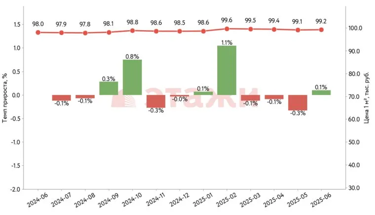 «Удельная цена предложения в июне 2025 года в среднем составила 99,2 тысячи рублей за квадратный метр. По сравнению с маем она выросла на 102 рубля (0,10%), а в годовом выражении увеличилась на 1 180 рублей (1,20%)», — говорится в записке компании «Этажи».