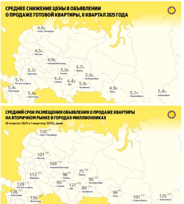 В среднем россияне в первом квартале 2025 года делали скидки на жилье в размере 4,6%, во втором квартале 2025 года размер дисконта достиг 5%. В топ-5 по размеру средней скидки вошли Краснодар, Красноярск, Волгоград и Челябинск (по -5,4%) и Воронеж (-5,2%).