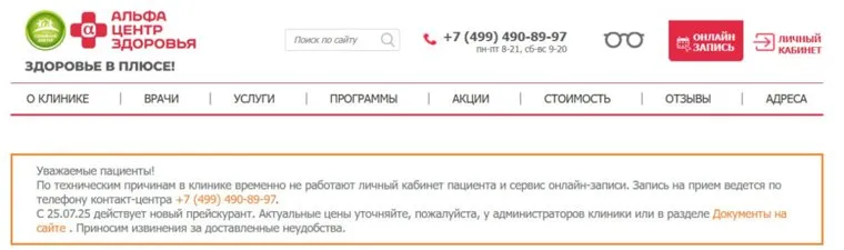 «По техническим причинам в клинике [„Семейный доктор“] временно не работает личный кабинет пациента и онлайн-запись», — сообщает «Альфа-центр здоровья». До этого сообщалось о сбоях в работе клиник «Столичка» и «Неофарм».