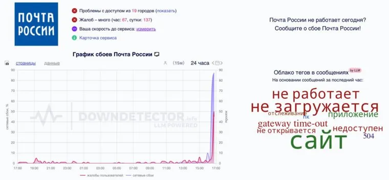 Согласно данным сервиса, свыше сотни человек начали потесать о сбоях в работе «Почты России». О неполадках стали сообщать ближе к 18:00 (по мск). Больше всего сообщений с жалобами поступало из Московской, Тверской и Самарской областей. Пока представители «Почты России» официально не прокомментировали ситуацию и не сообщили о причинах сбоя.