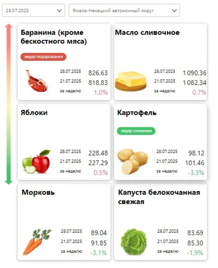 Также за минувшую неделю в округе значительно подорожала баранина и яблоки — 1% и 0,5% соответственно. При этом третью неделю подряд на Ямале дешевеет картошка. Сейчас ее средняя цена опустилась до 98,12 рублей за килограмм.