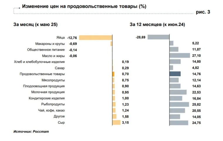 В то же время некоторые продукты питания в июне стали дешевле. Незначительно снизились цены на вермишель, гречневую и манную крупы, рис, горох и фасоль, а также на сливочное и оливковое масла. Особенно заметное снижение произошло на рынке яиц: благодаря росту производства по стране их стоимость сократилась почти на треть по сравнению с прошлым годом — на 28,69%.