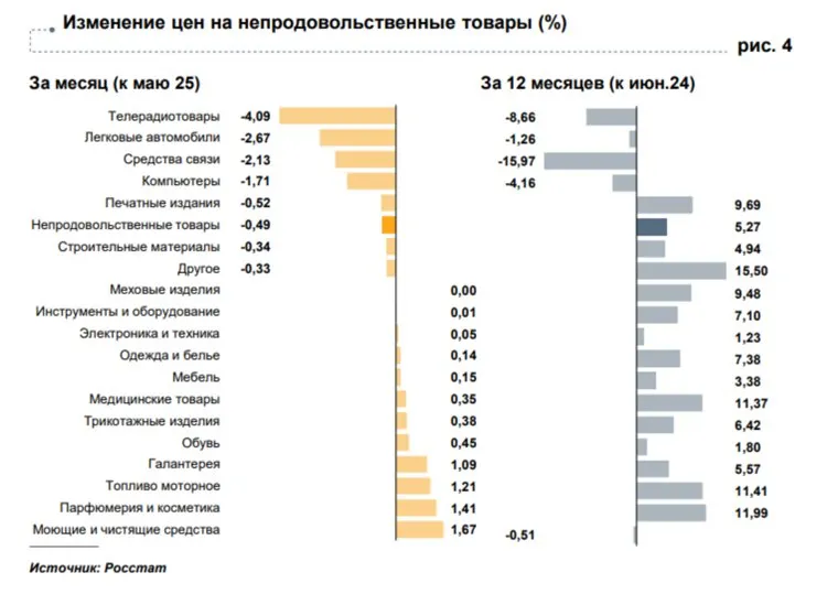 «Заметнее всего в июне подешевели телевизоры (4%), средства связи (2,1%), компьютеры (1,7%) и легковые автомобили (2,6%). На это в основном повлияли укрепление рубля и снижение спроса, вызванное в том числе охлаждением потребительского кредитования. В этих условиях некоторые дилеры скорректировали вниз цены на новые автомобили с целью реализации накопленных запасов, а подержанные автомобили подешевели на вторичном рынке в среднем еще сильнее», — рассказали в пресс-службе. Кроме того, за последние 12 месяцев наибольшее снижение стоимости зафиксировано на пылесосы, смартфоны и мониторы для персональных компьютеров.