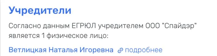 URA.RU выяснило, что у Ветлицкой есть компания «Спайдэр», которая была зарегистрирована еще в 1997 году. Она занимается куплей-продажей нежилой недвижимости. Генеральным директором является Наталья Ветлицкая. Артистка управляет ей с 2002 года. В компании всего три человека, она не имеет филиалов и представительств.