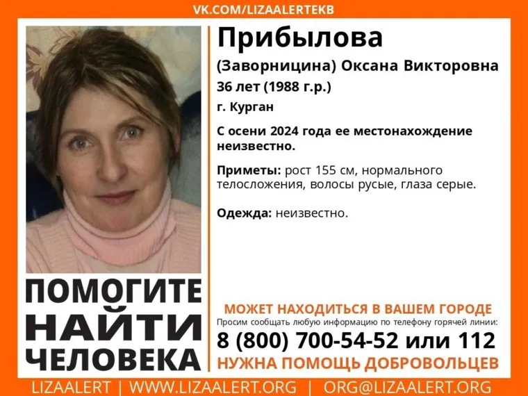 В Кургане разыскивают 36-летнюю Оксану Викторовну Прибылову (Заворницину), которая пропала осенью 2024 года. Ее местонахождение неизвестно. Об этом сообщает группа «Поисковый отряд „ЛизаАлерт“ Курганской области» в соцсети «ВКонтакте».