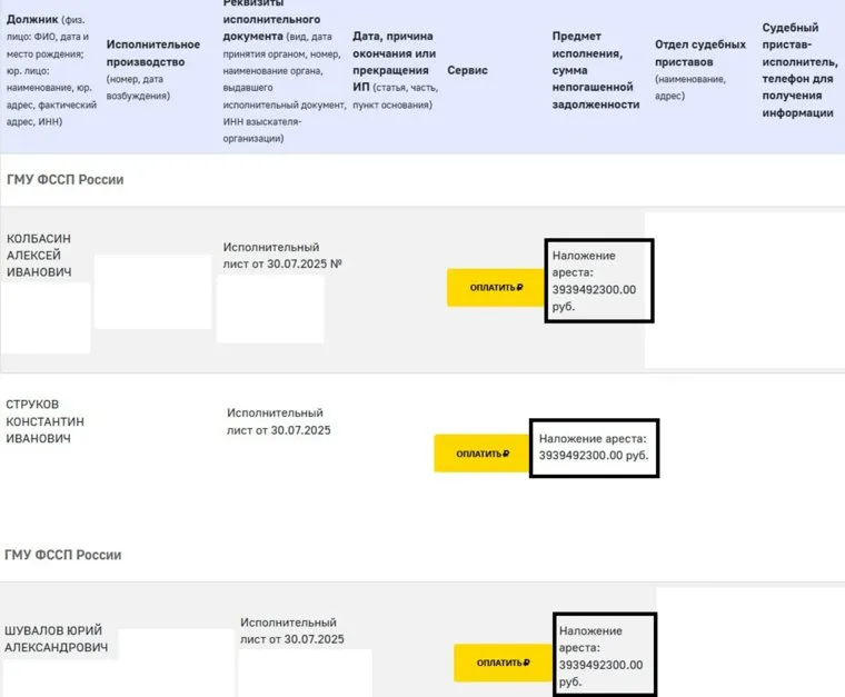«Колбасин Алексей Иванович. Исполнительный лист от 30 июля 2025 года. Наложение ареста: 3 939 492 300 рублей», — указано в базе.
