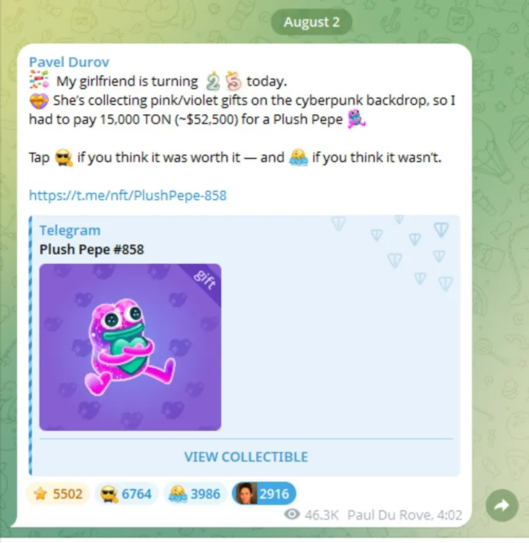 «Моей девушке сегодня исполняется 25 лет. Она собирает розовые/фиолетовые подарки в стиле киберпанка, поэтому мне пришлось заплатить 52 500 долларов за плюшевого Пепе», — рассказал Дуров в своем telegram-канале.