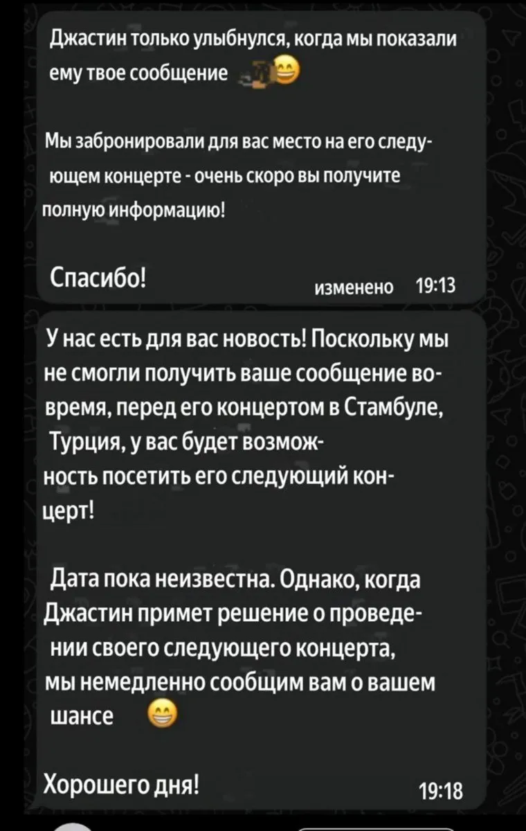«Мне второй раз написала команда Джастина и они сожалеют, что я поздно увидела сообщение и у Джастина закончился тур. Но когда у него снова будет тур, они меня позовут», — рассказала девушка в Instagram (принадлежит компании Meta, признана в России экстремистской и запрещена).