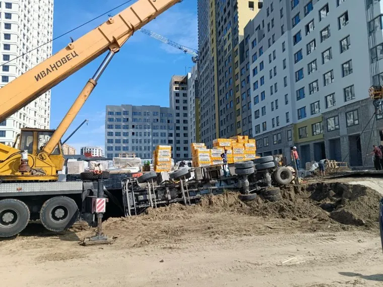 В Тюмени на стройплощадке перевернулась бетономешалка. Фото