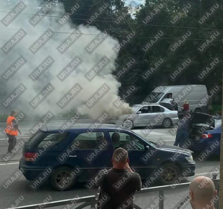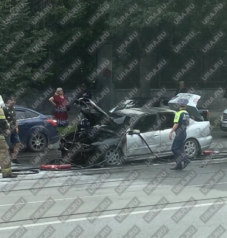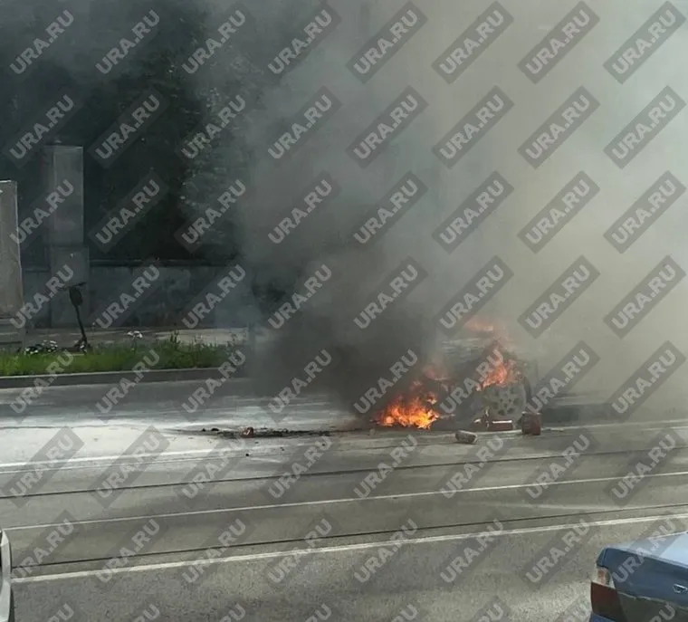 Иномарка загорелась посреди дороги в центре Екатеринбурга. Фото