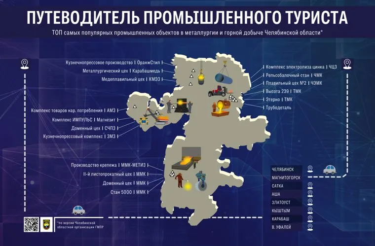 В списке есть универсальный рельсобалочный стан Челябинского меткомбината, где производятся длинные рельсы, и современный комплекс «Импульс» саткинского «Магнезита» с автоматизированным производством обжиговых изделий, где открываются уральские виды со смотровых площадок. В списке — 17 объектов. В их числе представлены «ММК-МЕТИЗ», цех Кыштымского медеэлектролитного завода, кузнечно-прессовый комплекс Златоустовского метзавода, металлургический цех «Карабашмеди» и площадки других предприятий.