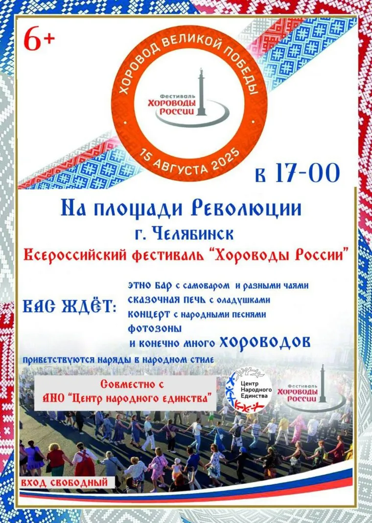 На площади Революции в Челябинске 15 августа впервые пройдет фестиваль «Хороводы России». Важным событием станет акция «Хоровод Великой Победы», посвященная 80-летию Победы в Великой Отечественной войне. Гостей ждут бесплатные угощения: оладьи и напитки разных народов, сообщила URA.RU региональный руководитель движения «Хороводы России» Ларионова.