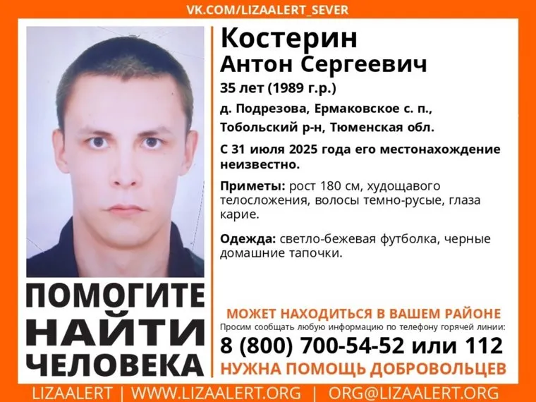 «Костерин Антон Сергеевич, 35 лет. Пропал в деревне Подрезова Тобольского района Тюменской области. С 31 июля его местонахождение неизвестно», — говорится в сообщении поисковиков.