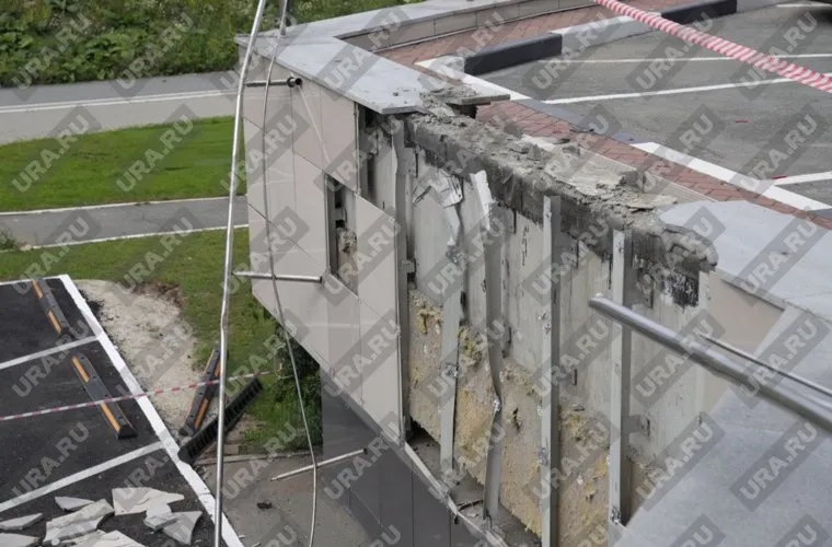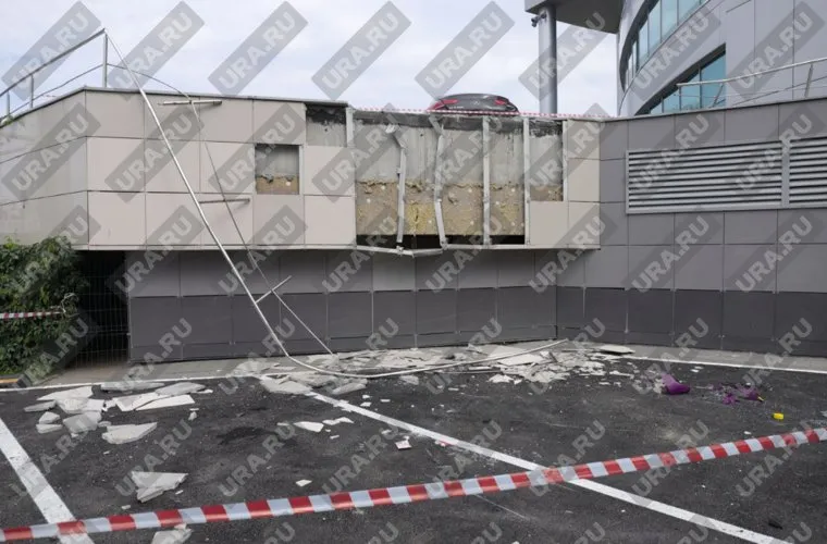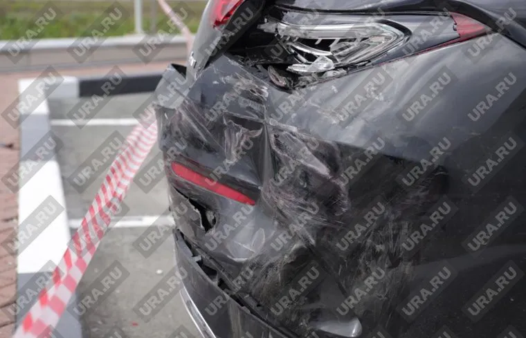 Екатеринбуржец на иномарке въехал в БЦ и вылетел с парковки, упав на крышу. Фото, видео