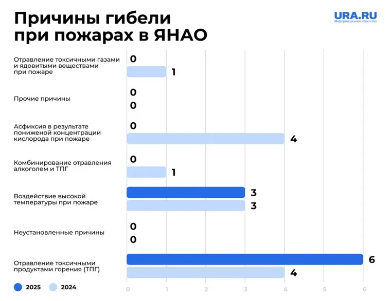 Основными причинами гибели в 2025 году стало отравление продуктами горения. Второй причиной названа непосредственная гибель в огне. В 2024 году люди погибали и по другим причинам.