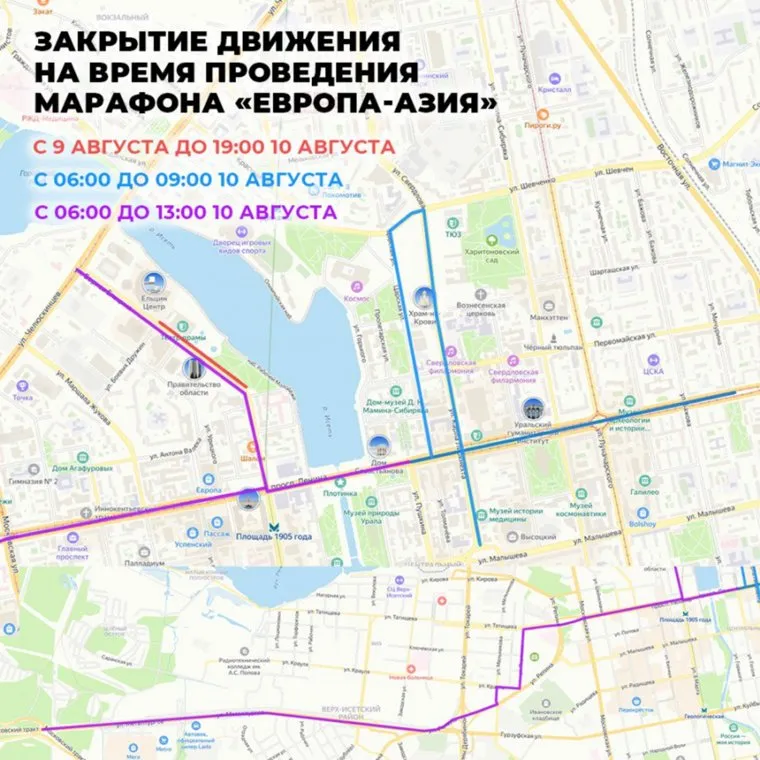 На два дня в Екатеринбурге перекроют ряд центральных улиц вплоть до Пермского тракта. Дороги будут недоступны с 00:01 9 августа до 19:00 10 августа.
