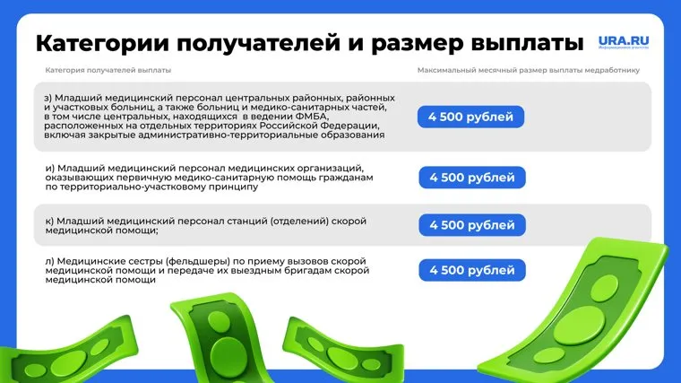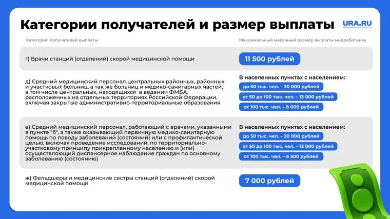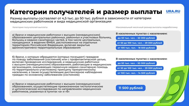 Размер выплат колеблется от 4500 до 50 тысяч рублей — в зависимости от населенного пункта и специализации. Например, медики, работающие в населенных пунктах с численностью до 50 тыс. человек, получают 50 тыс. рублей.