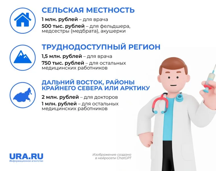 Для привлечения кадров в отдаленные районы действует программа «Земский доктор». Медики, переезжающие в села и малые города, могут получить: 1 млн рублей — врачам, 500 тыс. — фельдшерам и среднему медперсоналу.