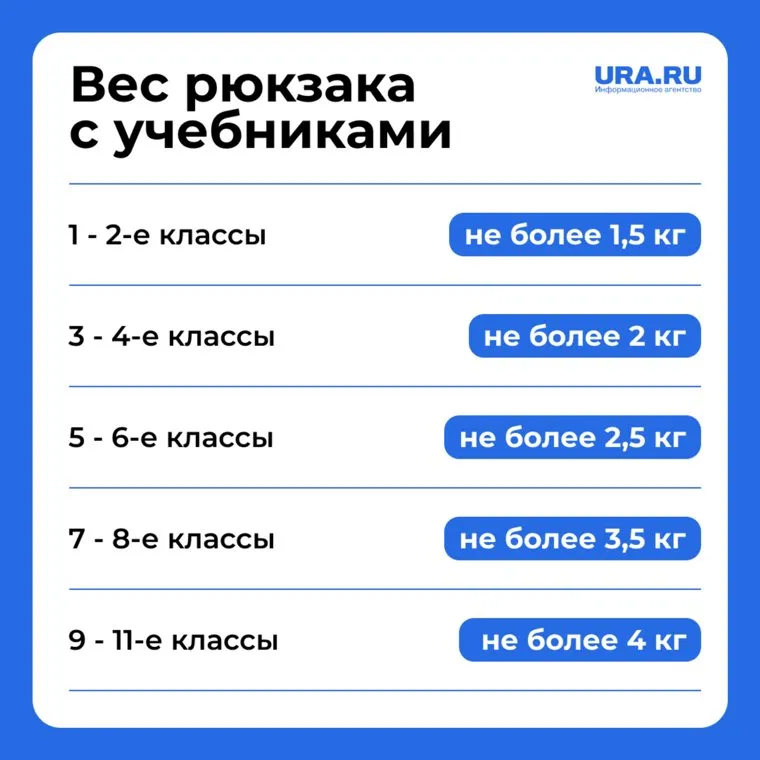 В младших классах вес рюкзака не должен превышать 1,5 кг