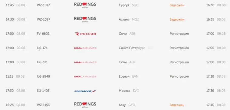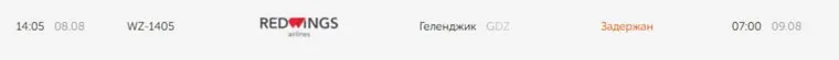Согласно расписанию, задержаны рейсы WZ-1017 в Сургут, WZ-1097 в Астану, WZ-1153 в Баку и WZ-1405 в Геленджик. Вылеты перенесли от часа вплоть до 15 часов.