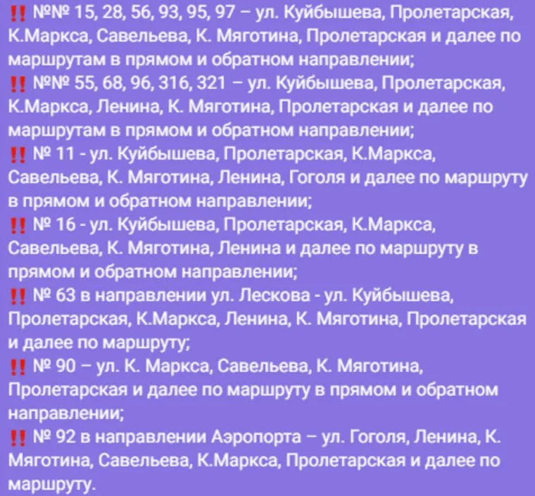 Автобусы маршрутов № 15, 28, 56, 93, 95, 97, 55, 68, 96, 316, 321, 11, 16, 63 и 90 будут следовать в объезд через улицы Куйбышева, К.Маркса, Савельева, Ленина, Гоголя и К. Мяготина. Автобус №92 в направлении аэропорта также изменит привычный маршрут. Посадка и высадка пассажиров будут осуществляться на всех действующих остановках.