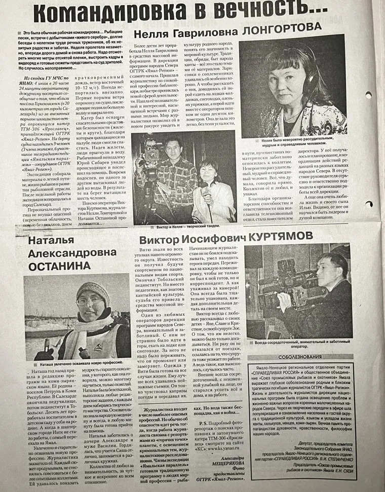 16 лет прошло со дня трагедии, унесшей жизни журналистов телерадиокомпании «Ямал-Регион» Нелли Лонгортовой, Виктора Куртямова и Натальи Останиной, но память о них остается живой. Каждый год в этот день журналисты Ямала собираются у памятника «Исполнившим журналистский долг», чтобы почтить память своих коллег и напомнить себе о том, насколько может быть опасен труд журналиста. Журналисты «Ямал-Медиа» всегда находятся там, где их ждут земляки, и именно с ними тундровики готовы поделиться своими проблемами. Юлия Накова, журналист «Ямал-Медиа», отмечает, что этот день служит напоминанием об опасности их профессии. Коллеги продолжают помнить о погибших товарищах, чтя их память и осознавая риски, с которыми сталкиваются в своей работе. Артем Чефранов, бывший генеральный директор ГУ ОГТРК «Ямал-Регион», подчеркивал, что основной задачей руководства компании является предотвращение подобных трагедий в будущем.