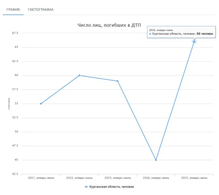 «За январь—июль 2025 года в Курганской области в дорожно-транспортных происшествиях погибли 66 человек. Это на 47 процентов больше, чем за аналогичный период 2024 года», — говорится в данных МВД РФ на портале ЕМИСС. Кроме того, нынешний показатель стал самым высоким с 2021 года.