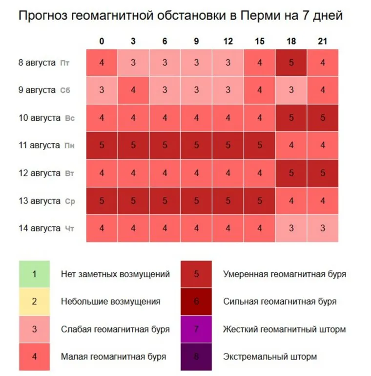 «С 9 по 10 августа значения будут колебаться от слабых до умеренных. С 11 по 13 августа ожидается новый всплеск активности магнитных бурь в Прикамье. С 14-го — начнется постепенный спад», — свидетельствуют данные сервиса.