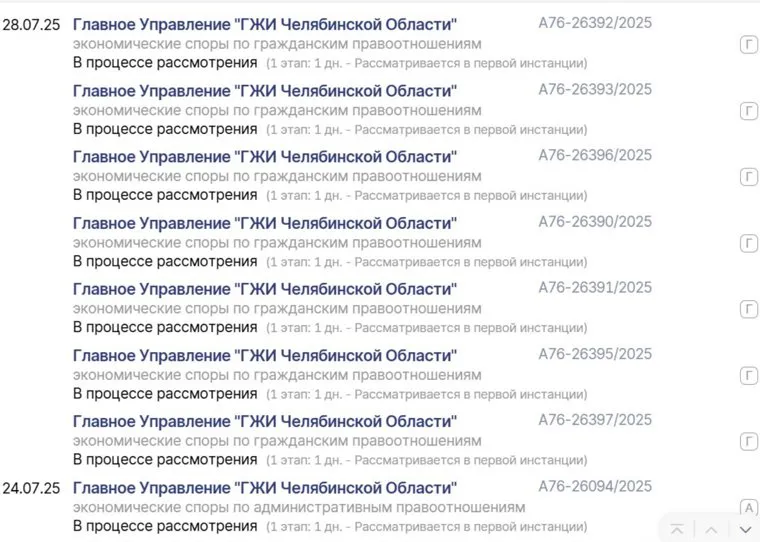 «Ответчик — Главное управление „ГЖИ Челябинской области. Экономические споры по гражданским отношениям. Дело находится в процессе рассмотрения“, — следует из сервиса СБИС. Таким образом „коммунальный король“ пытается оспорить не менее 10 штрафов на сумму около трех миллионов рублей.