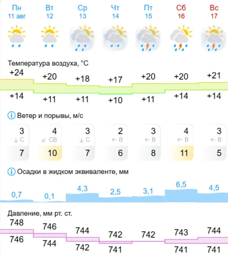 В Муравленко в понедельник прогнозируют последний на неделе безоблачный день — 24 градуса. Ветра поднимут облака над городом, а в четверг уже ожидают сплошные ливни. Температура упадет до 17 градусов, в пятницу и воскресенье синоптики ждут и грозы. Подобную погоду ждут и в Губкинском, там в четверг прогнозируют вместе с дождями и туман. В Лабытнанги помимо дождей с четверга по воскресенье пройдут и сильные ветра — там скорость ветров может достигать до 12 метров в секунду, к выходным столбики термометров там упадут до 18, ночью — до 14. Солнечная погода устойчивее всех сохранится в Тазовском: в райцентре одноименного муниципалитета безоблачные дни сохранятся до вторника, средняя температура — 21 градус.