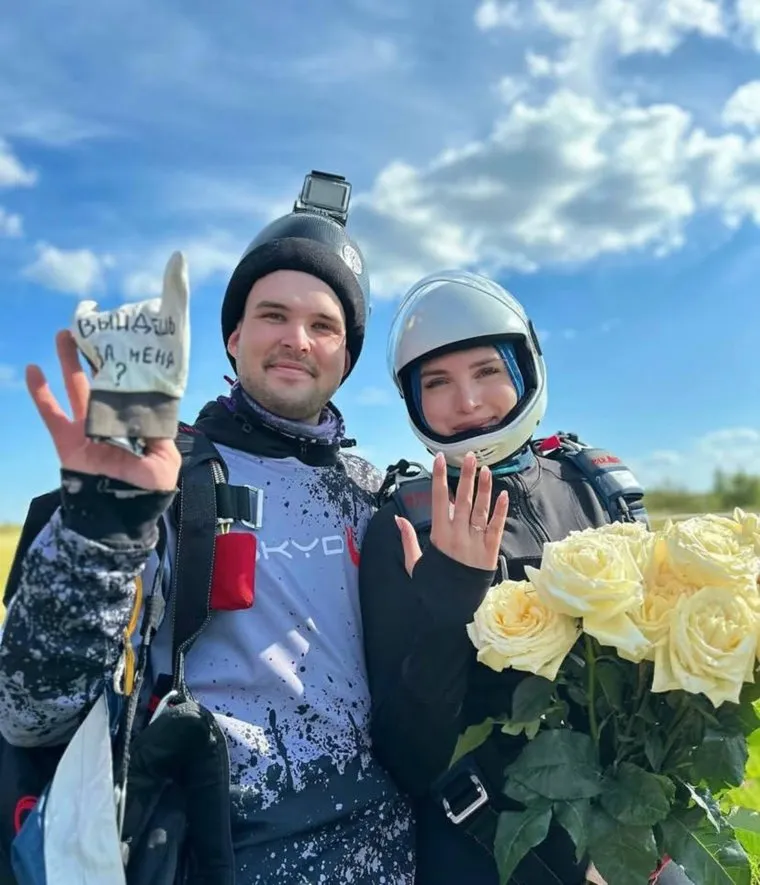 «Теперь невеста! Вышли в сцепе с 3 000 метров, стабилизировалась. Падаем. Стас опускаем мою руку и показывает свою перчатку, где написано: „Ты выйдешь за меня?“. Конечно, да!», — рассказала Дьяченко в своем аккаунте в Instagram* (принадлежит компании Meta, признанной в России экстремистской и запрещенной). Летчица призналась, что растрогалась до слез. На земле пару поджидали фотографы, а невесте вручили букет.