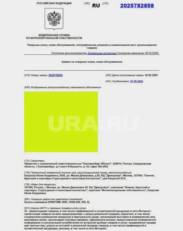 Сеть профессиональной косметики и парфюмерии «Золотое Яблоко» из Екатеринбурга подала заявку в Роспатент на регистрацию фирменного лаймового цвета, он является ключевым элементом бренда. Об этом URA.RU рассказали в пресс-службе компании.