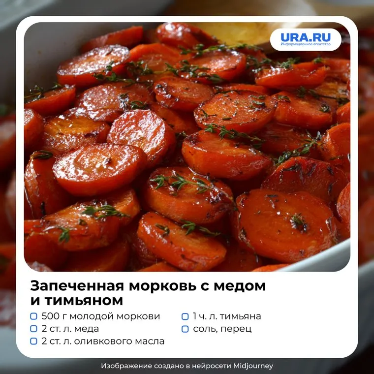 Смешайте масло, мед, тимьян, соль и перец. Полейте морковь и запеките при 200 °C около 25–30 минут.