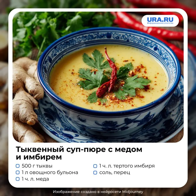 Тыкву нарежьте, отварите в бульоне, добавьте имбирь и мед. Измельчите блендером до кремовой консистенции.