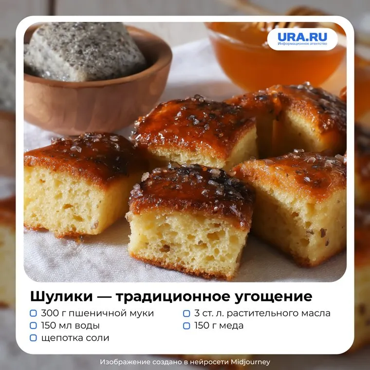Смешайте муку, воду, соль и масло, замесите тесто. Раскатайте пласт толщиной 0,5 см, нарежьте на ромбики, выпекайте 15–20 минут при 180°С. Готовые шулики полейте подогретым медом.