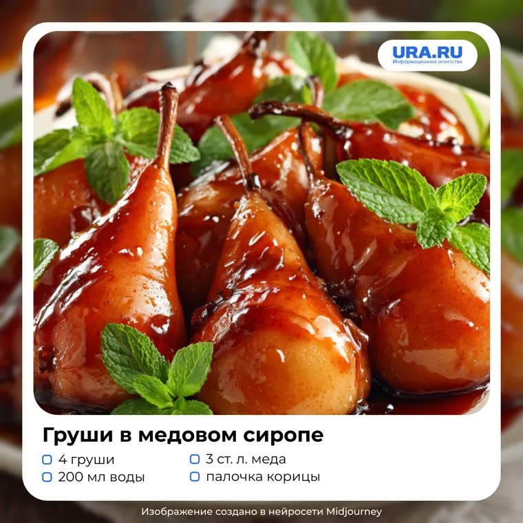 Сварите сироп из воды, меда и корицы. Добавьте груши, нарезанные дольками, и томите на медленном огне 10–15 минут.