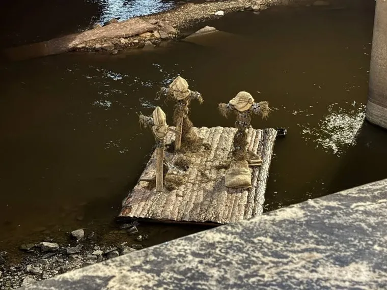 «Ужасы на ночь»: тюменцы заметили на набережной дрейфующий плот с чучелами. Видео