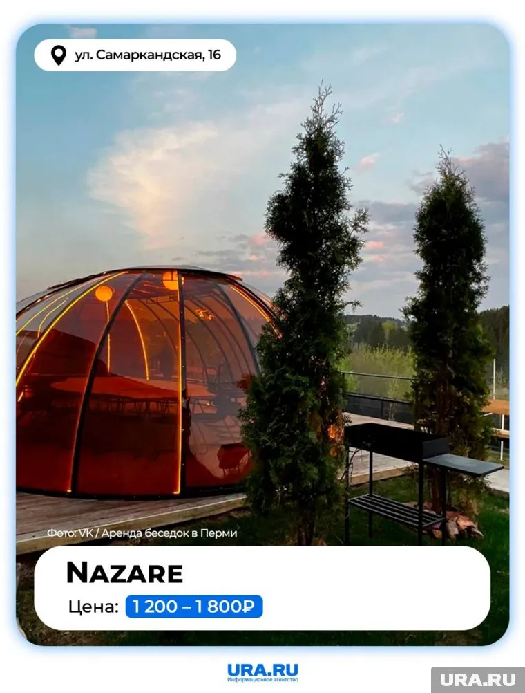 Барбекю-парк Nazare расположен на улице Самаркандской, 16 в Свердловском районе. На площадке установлены три купольные беседки с террасами и мангальными зонами. Они стоят от 1200 до 1800 рублей за час. На территории можно поиграть в бадминтон, волейбол, баскетбол или пионербол. Для детей доступны игровая площадка и карусели.