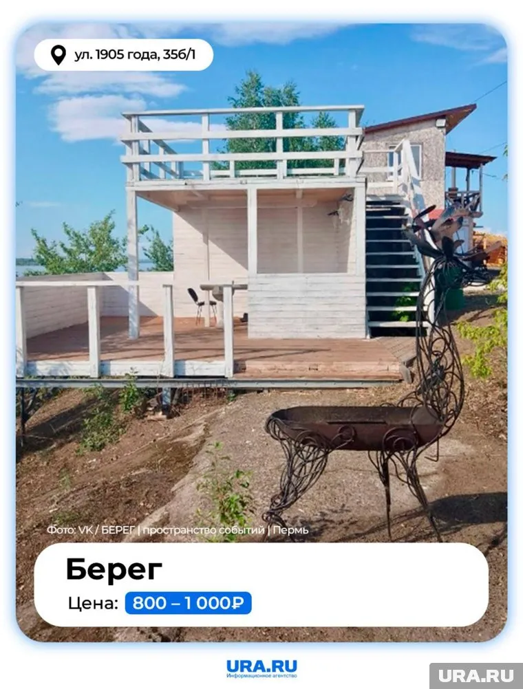 Пространство событий «Берег» находится на берегу Камы по улице 1905 года, 35б/1. На площадке проводятся различные концерты и вечеринки. Для барбекю можно взять в аренду двухэтажный домик или использовать отдельные мангальные зоны. Стоимость варьируется от 800 до 1000 рублей. На территории есть зоны для рыбалки и игры в лазертаг. Напрокат здесь можно взять водные лыжи, «бублики» и сапборды.