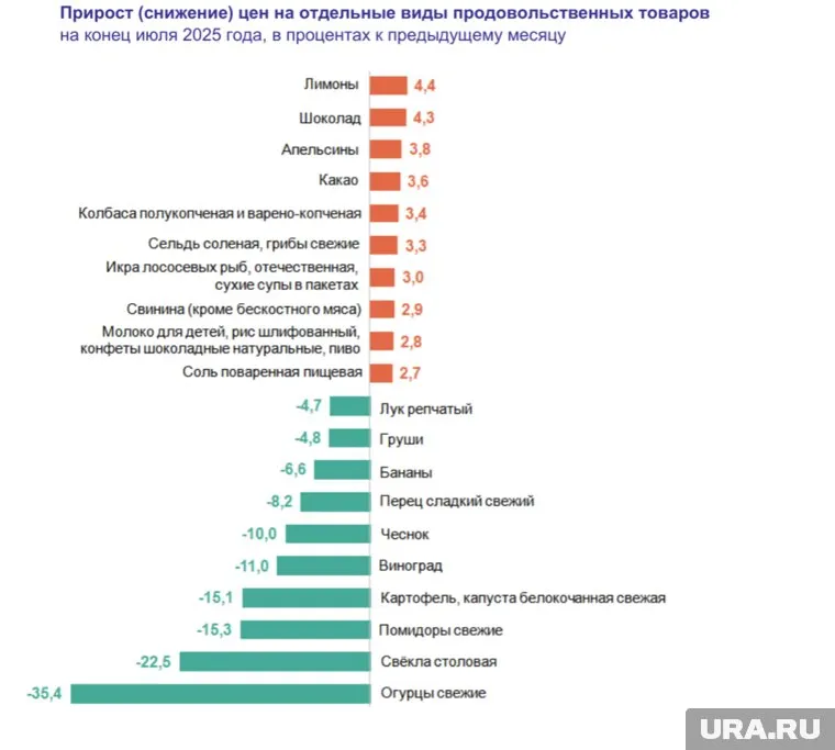 «Прирост (снижение) цен на отдельные виды продовольственных товаров на конец июля 2025 года, в процентах к предыдущему месяцу. Лимоны подорожали на 4,4%, шоколад на 4,3%, апельсины 3,8%, какао 3,6% колбаса копченая и полу-копченая на 3,4. Подешевели: лук на 4,7%, огурцы на 35,4%, свекла 22,5%», — рассказали нам.