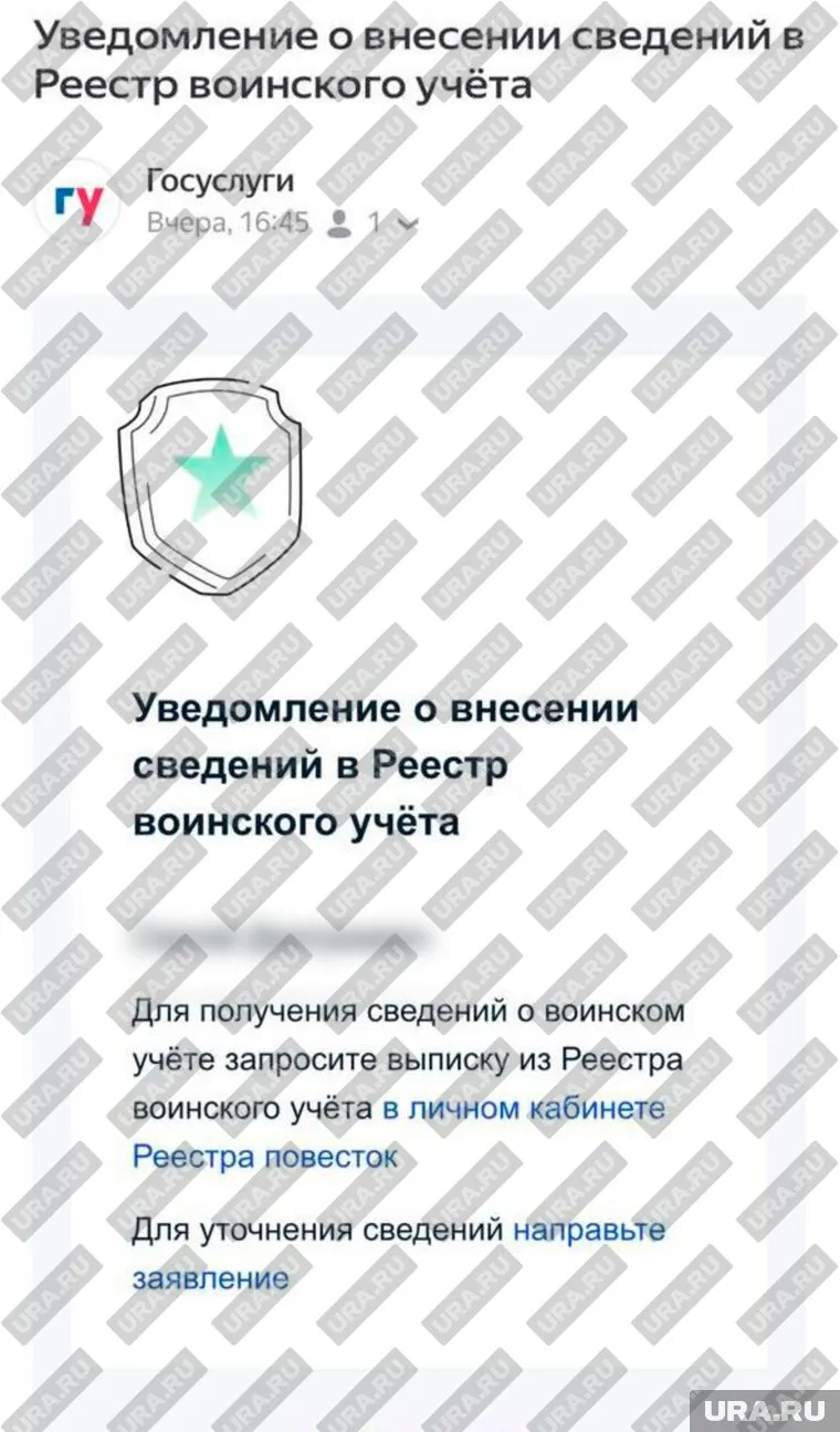 Жители Свердловской области продолжают массово получать уведомления о воинском учете через «Госуслуги». В рассылке сообщают о внесении сведений в реестр воинского учета.