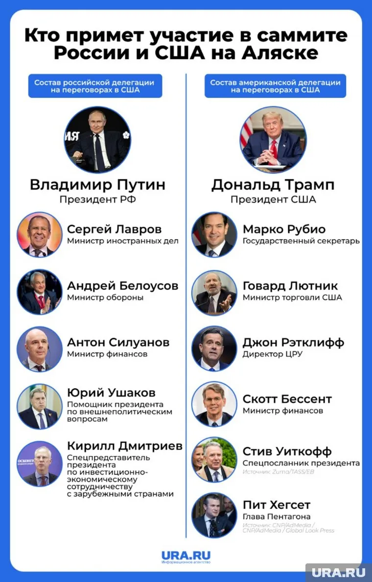 20:40 Американскую делегацию на переговорах представят Дональд Трамп, вице-президент Джей Ди Вэнс, спецпосланник президента Стив Уиткофф, госсекретарь Марко Рубио и министр финансов Скотт Бессент. В последний момент в состав делегации вошли министр обороны Пит Хегсетт и директор ЦРУ Джон Ли Рэтклифф. Развернутая информация о каждом их перечисленных представителей и других участниках переговоров — здесь.